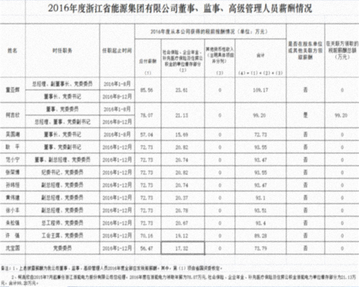 2016年度浙江省能源集團有限公司董事、監事、高級管理人員薪酬情況